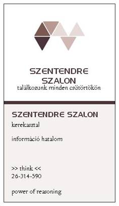 Elhatároztuk, hogy a SZENTENDRE SZALON hivatkozással rendszeresen találkozni fogunk egymással és meghívott vendégeinkkel.  A SZENTENDRE SZALON nem képez politikai-, társadalmi- vagy gazdasági szervezetet, -társaságot, így nem tartozik az azok működését szabályozó törvények hatálya alá.